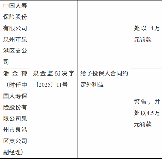 11月25日,泉州金融监管分局行政处罚信息公示表显示,中国人寿保险股份有限公司泉州市泉港区支公司因给予投保人合同约定外利益被罚款14万元;潘某鞭被警告并罚款4.5万元。